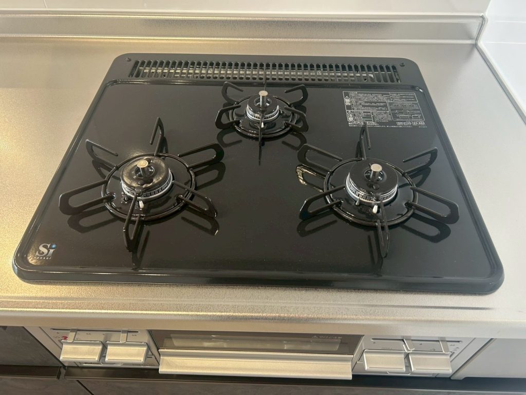3口コンロ、L字型2面バルコニー、ダイニングカウンター式対面キッチン、